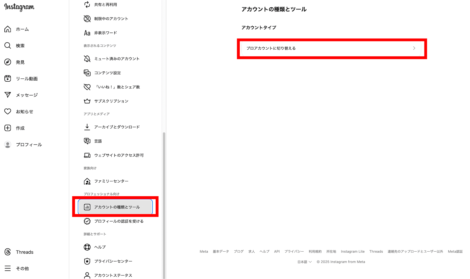 次に「アカウントの種類とツール」から「プロアカウントに切り替える」を選択すれば、プロアカウントに切り替わります。