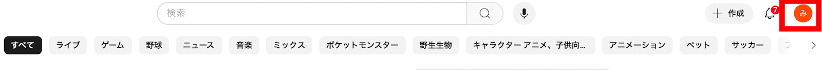 PCでYouTube画面を開いた際に、以下のように右上の自身のアイコンをタップしてください。
